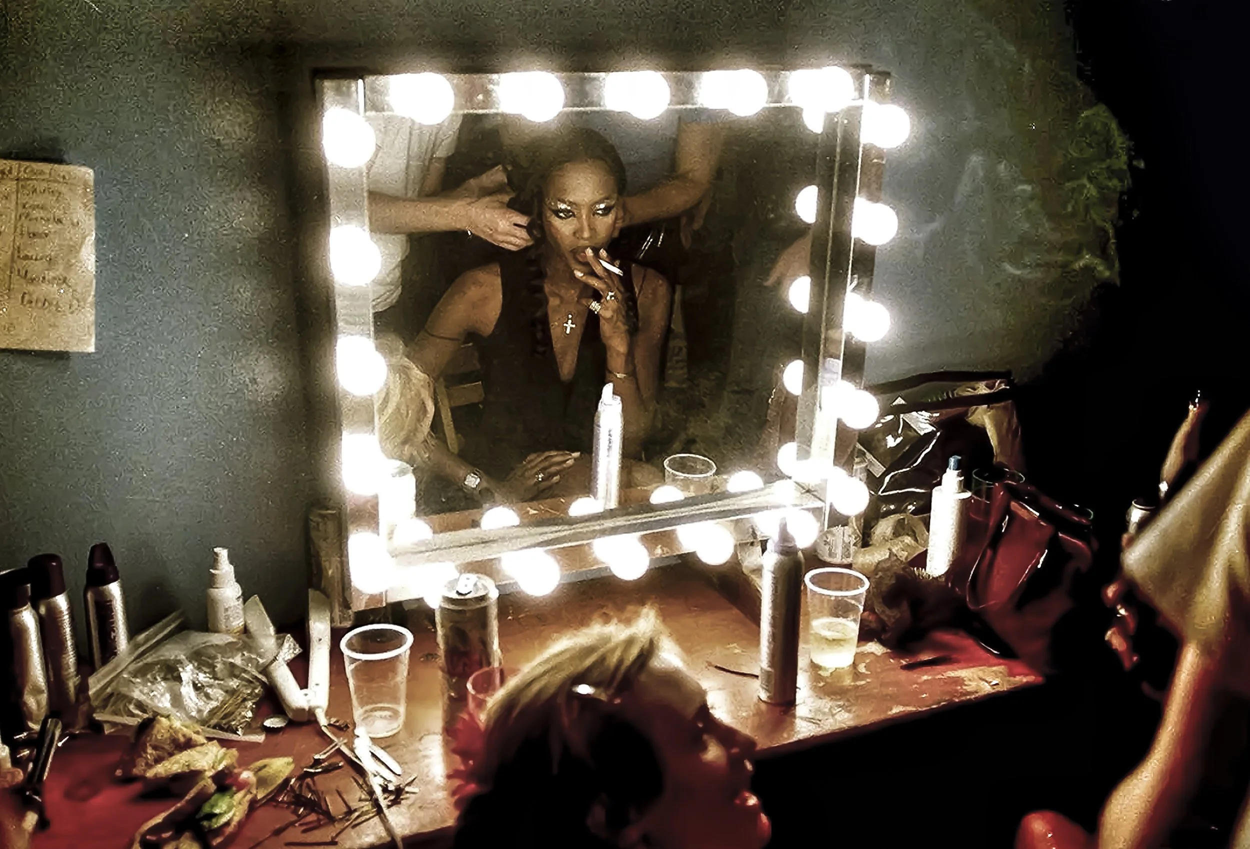 This was not normally how things were. It was usually nice and relaxed, you could take a couple of frames and move on. This particular day I was using a Nikon F3 camera that you could take the prism off the top and look down into it, like a Rolleiflex camera. I stood side-on between these two security guys and tried to guess the distance to her reflection in the mirror. I would have been using 400 asa film with the lens wide open and consequently a very limited depth of field. The shutter speed was probably about 1/60th of a second. I only made two of three frames before rushing off. I couldn’t wait any longer because I needed to get to my spot near the catwalk. The picture was used big in a couple of the broadsheets the following day. If you asked me tomorrow what my favourite photograph is I would probably choose a different picture entirely and have completely different reasons for that choice.